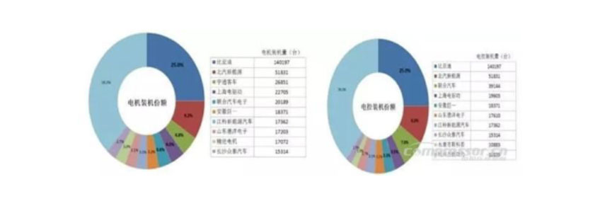 整車企業自配電機電控占到一半以上。比亞迪與北汽新能源兩家車企2016年電機電控裝機量分別為14.02萬臺和5.18萬臺,市場占有率合計達34.2%。第三方制造商中,上海電驅動、聯合汽車電子、安徽巨一位居靠前。