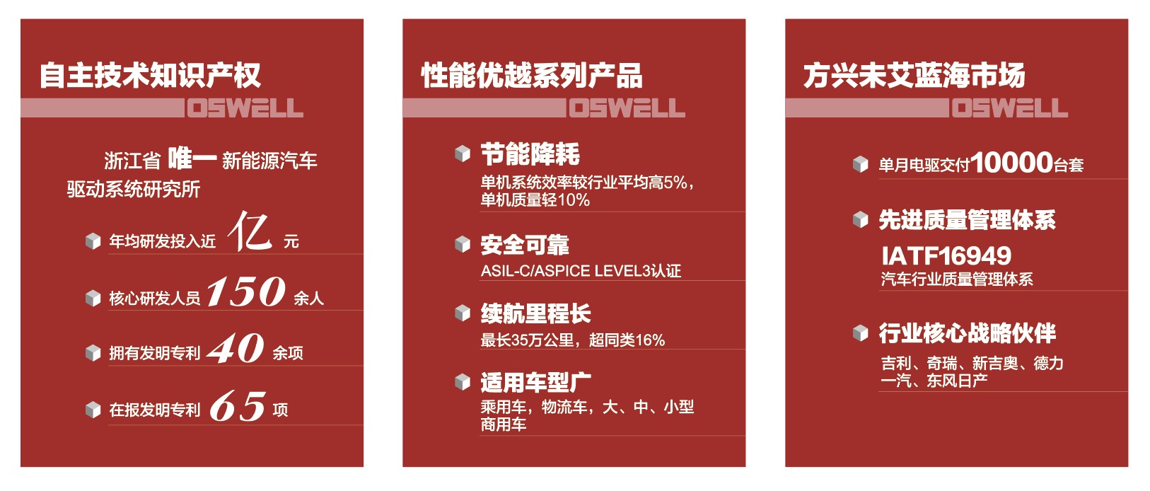 公司掌握新能源汽車電驅動系統核心技術,有著先進的工藝設備、雄厚的產品開發能力、可靠的檢測手段、完善的管理體系,同時具有完善的產業化設計和生產能力,擁有豐富的產品系列,制造出符合國際標準、節能、安全可靠的產品,銷往全國各地及世界多國。一直以來,奧思偉爾堅持“博采眾長,創新發展”的發展思路,力求滿足客戶需求,使奧思偉爾成為備受社會尊重的企業。