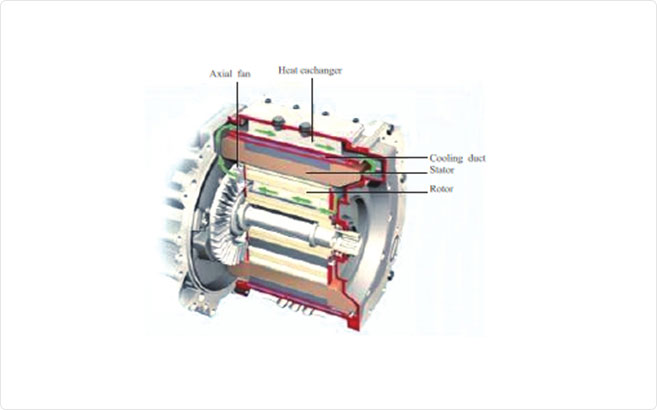 噴油冷卻是目前前沿的冷卻方式,具有散熱效率高,可直接接觸電機內部發(fā)熱部件的特點,但是復雜的油路系統(tǒng)設計及工藝限制了其發(fā)展。由于其突出的優(yōu)勢,很多廠家及研究機構都投入到對噴油冷卻方式的研究,爭相占據技術領先位置。 奧思偉爾對端部噴油技術做了相關的研究并應用于生產,通過調整不同位置噴油嘴之間的流量分配,相應的流速分配使得冷卻效率最高,優(yōu)化噴油嘴外形設計,優(yōu)化滲流路徑,優(yōu)化噴射后流體滲透流經的繞組端部、鐵芯的路徑和方式,提高散 熱效率,以提高電機功率密度。