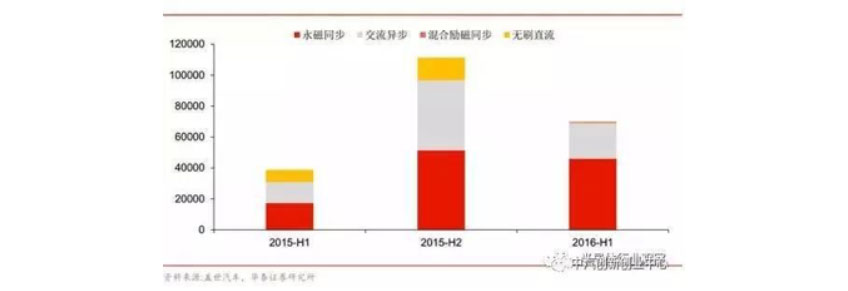 我國稀土資源豐富, 因此電動乘用車多采用功率性能高、體積較小的永磁同步電機。 根據中國汽車工業協會統計數據,2016 年上半年,我國純電動汽車產銷量分別達到 13.4 萬輛、12.6 萬輛,同比分別增長 160.8%、 161.6%。上半年生產純電動乘用車約 70000 輛,其中永磁同步電機的裝機占比約為 65.7%,比 15 年同期增長 21.25 個百分點,比 15 年全年增長了 19.99 個百分點。